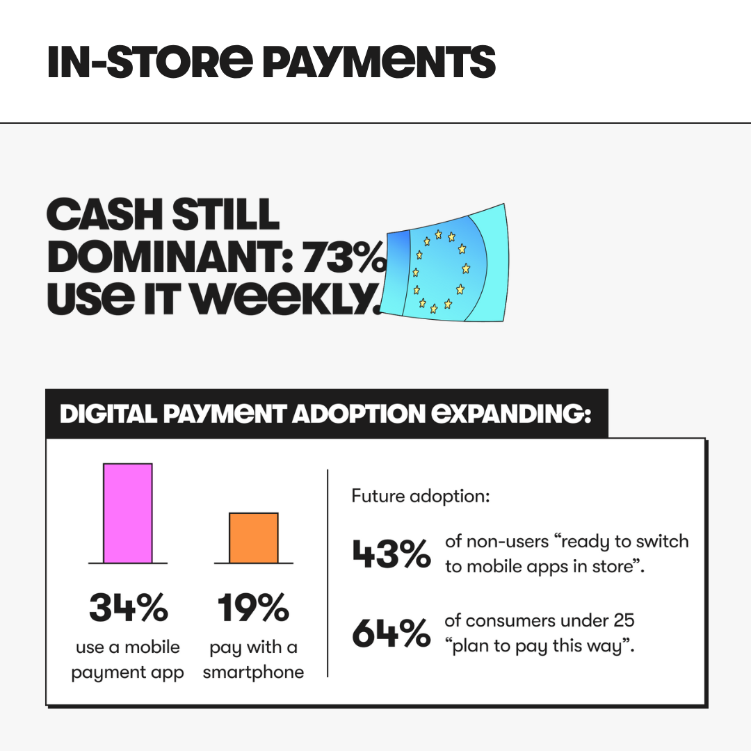 Cash remains dominant in brick-and-mortar retail, with 73 percent weekly use. Nevertheless, 50 percent of consumers already rely on contactless digital payments – 34 percent via app such as Wero, 19 percent with digital wallets on smartphones or smartwatches.