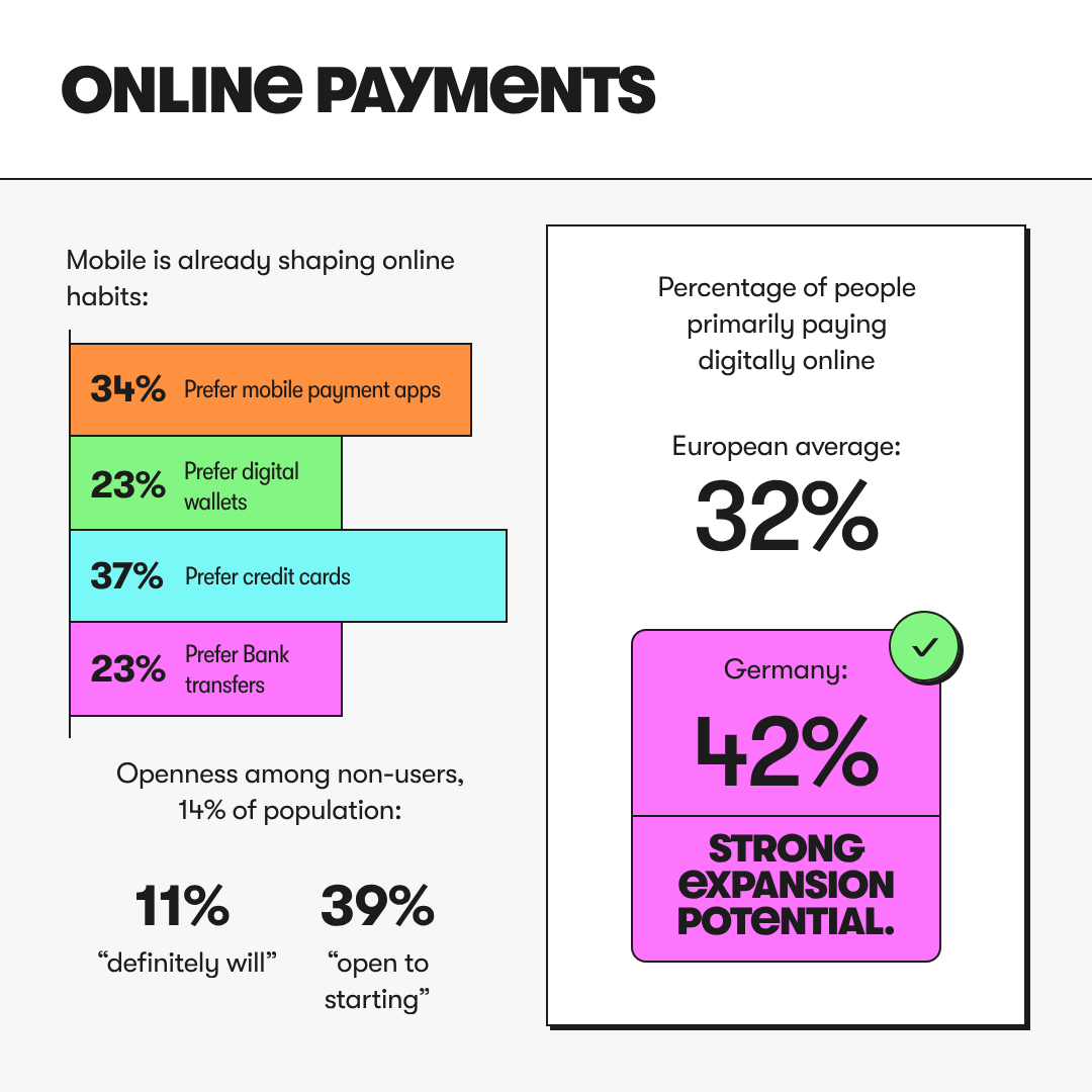 The willingness to use them is also increasing: Among the 14 percent who have not yet used mobile payment apps, 39 percent say they would like to do so in the future – 11 percent with firm intentions. This puts Germany above the European average (32 percent) and offers high growth potential.